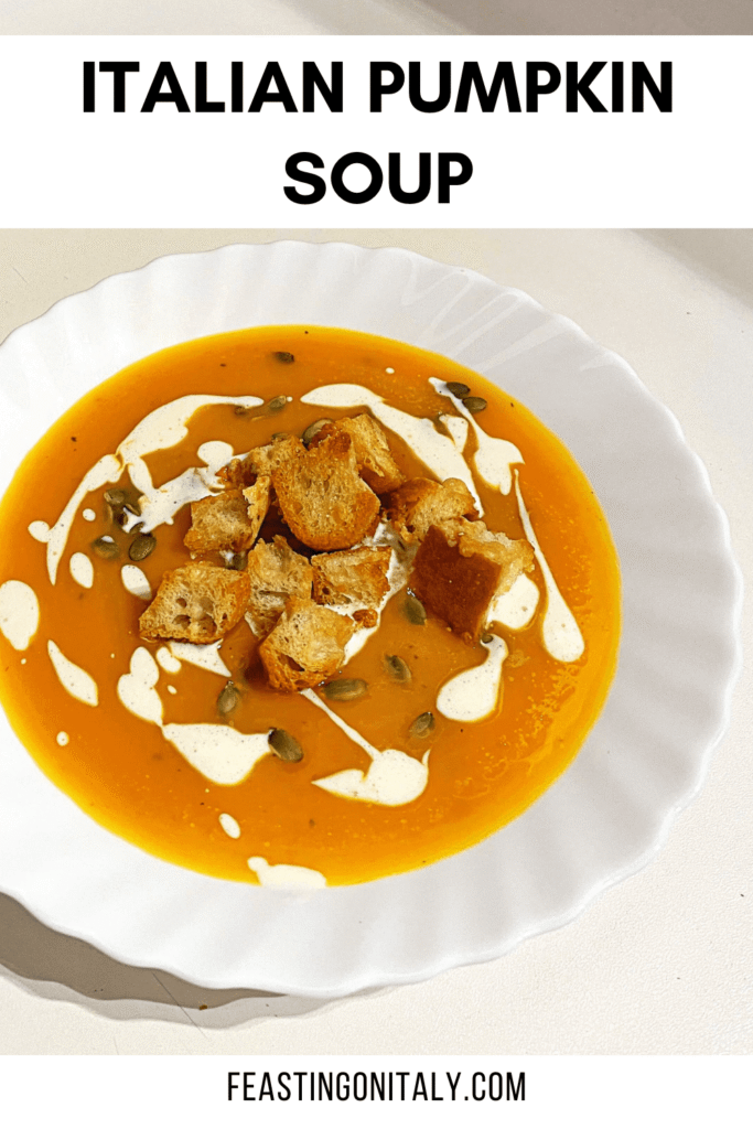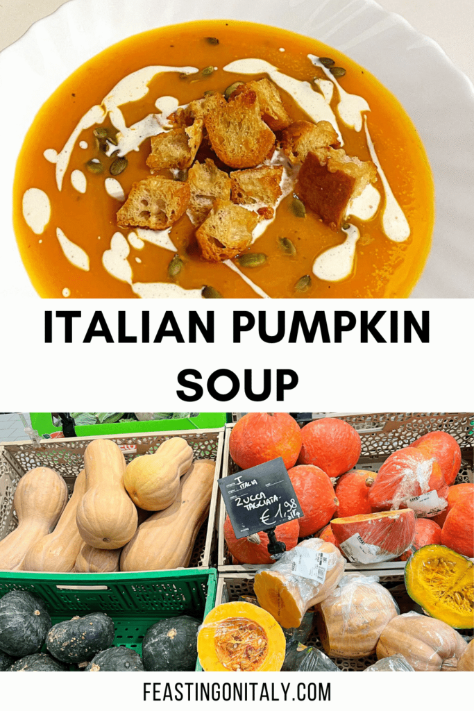 I always loved butternut squash soups when living in America and I was excited to discover something comparable in Italy. First, something to note is that in Italian, the word zucca, translates literally to pumpkin, but its meaning encompasses all types of pumpkins and winter squash varieties. Whereas in America, we tend to only use the word pumpkin when talking about Halloween and not the culinary varieties.