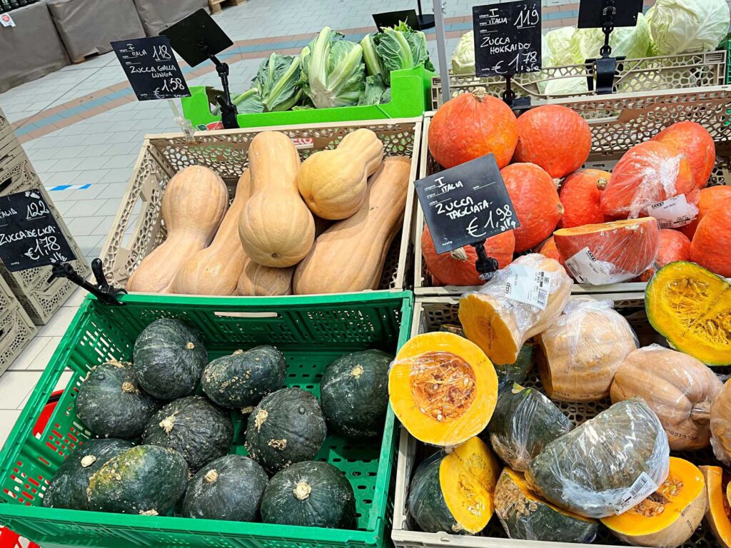 While it is possible to find butternut squash in some supermarkets in Italy, it’s not as commonplace as in America. Italy grows many other varieties with varying tastes, some more sweet and some more vegetal. Some are so large that I wonder what kind of knife is required to cut them. Thank goodness the supermarket sells some squash already precut, zucca tagliata.