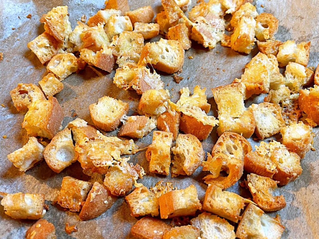 - Bake for 10-15 minutes or until golden brown, flipping the bread cubes halfway through.